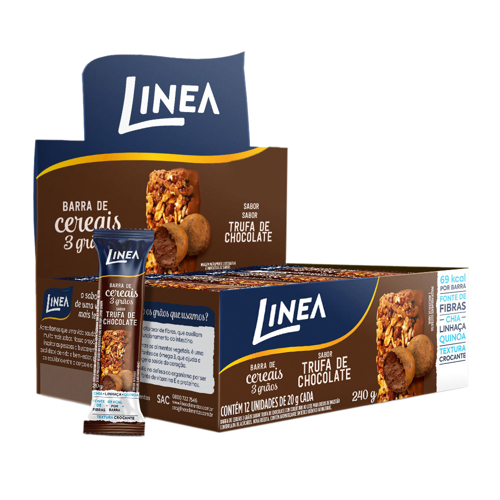 Linea Barra de Cereal 3 Grãos Integrais Trufa de Chocolate é indulgente, nutritiva e possui 69kcal por barra. Em sua composição, possui 3 grãos integrais, chia, linhaça e quinoa. Fonte de fibras, sem adição de açúcares, é adoçado com maltitol e sorbitol (adoçantes derivados do milho), possui baixo teor de sódio. Tudo isso com uma estrutura crocante e deliciosa, sendo ideal para segurar a fome até a próxima refeição.