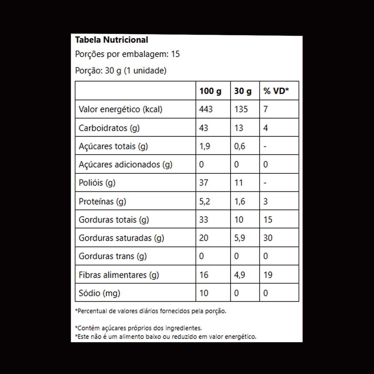| Açúcares adicionados (g) | 0 | 0 | 0 |