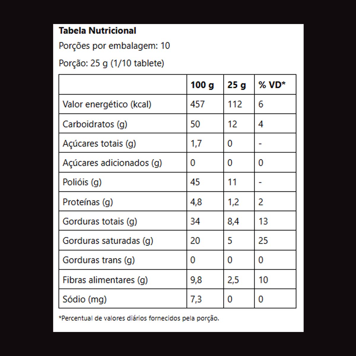 massa de cacau, manteiga de cacau, gordura vegetal de palma, edulcorante maltitol, umectante polidextrose, emulsificantes: lecitina de soja e poliglicerol polirricinoleato e aromatizante. ALÉRGICOS: CONTÉM DERIVADOS DE SOJA. PODE CONTER LEITE. NÃO CONTÉM GLÚTEN. NÃO CONTÉM LACTOSE