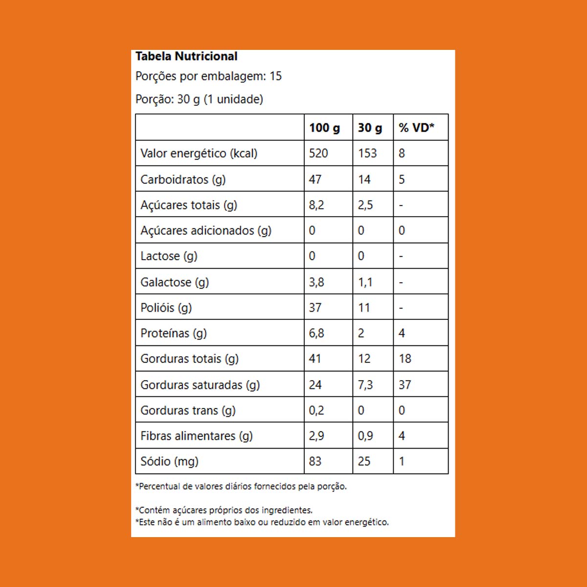 - Manteiga de cacau, leite em pó integral zerol actose, massa de cacau, edulcorante maltitol, emulsificantes: lecitina de soja e poliglicerol polirricinoleato e aromatizante. CONTÉM DERIVADOS DE LEITE E SOJA. NÃO CONTÉM GLÚTEN.