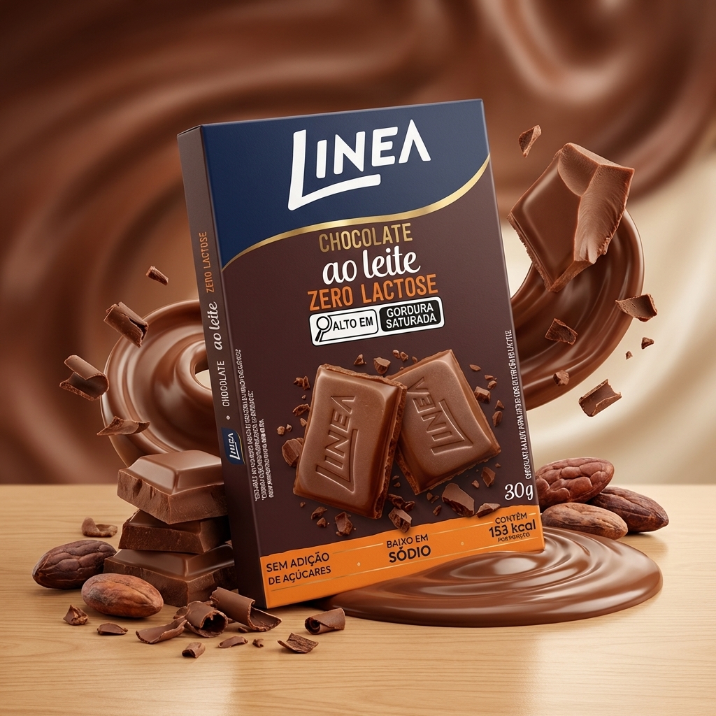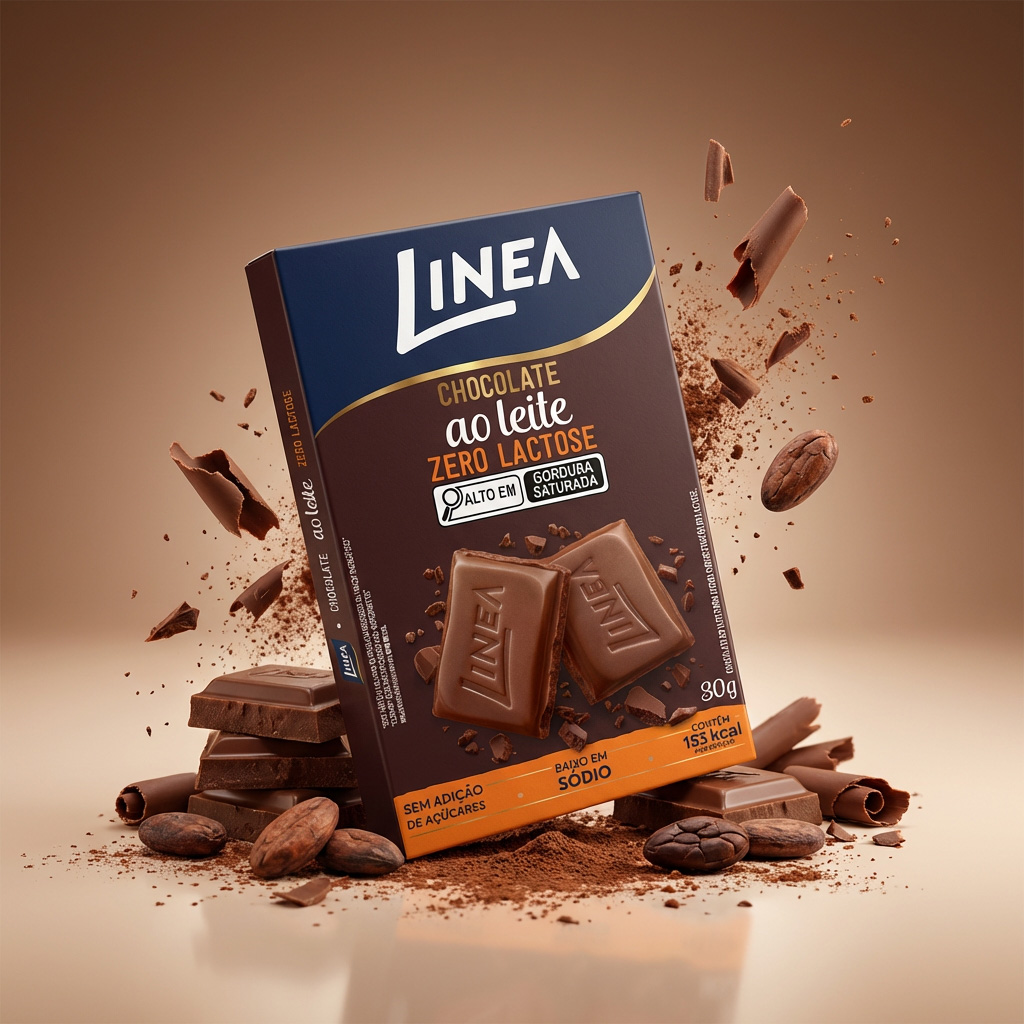 Linea Chocolate Ao Leite Zero Lactose é sem adição de açúcares. Adoçado com sucralose e maltitol, contém 153kcal por porção. Com a manteiga de cacau como o 1º ingrediente, resulta em um chocolate macio, cremoso e baixo em sódio. Sabor indescritível que derrete na boca!