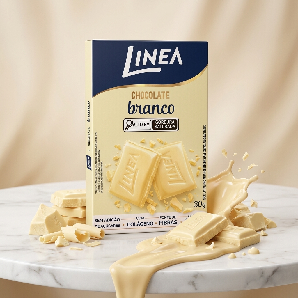 Linea Chocolate Branco é sem adição de açúcares. Adoçado com sucralose e maltitol, contém 147kcal por porção. Com a manteiga de cacau como o 1º ingrediente, resulta em um chocolate macio e cremoso. Com colágeno, é fonte de fibras. Sabor indescritível que derrete na boca!
