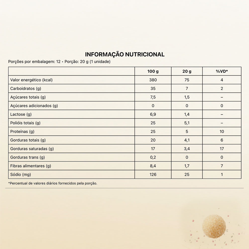 100 g 20 g % VD* Valor energético (kcal) 380 75 4 Carboidratos (g) 35 7 2 Açúcares totais (g) 7,5 1,5 - Açúcares adicionados (g) 0 0 0 Lactose (g) 6,9 1,4 - Polióis (g) 25 5,1 - Proteínas (g) 25 5 10 Gorduras totais (g) 20 4,1 6 Gorduras saturadas (g) 17 3,4 17 Gorduras trans (g) 0,2 0 0 Fibras alimentares (g) 8,4 176 7 Sódio (mg) 126 25 1