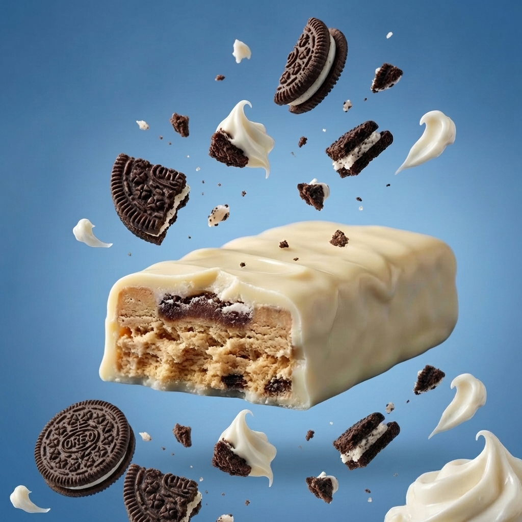 Cobertura branca, recheio sabor cookies'n cream, concentrado proteico de soro de leite em pó (whey protein), concentrado proteico de leite em pó (whey protein), gordura vegetal de palma, isolado proteico de soro de leite, colágeno hidrolisado, glicerina bidestilada, biscoito triturado de cacau, edulcorante maltitol, umectante polidextrose, emulsificante lecitina de soja, aromatizante, conservador sorbato de potássio e antioxidante tocoferol. ALÉRGICOS: CONTÉM DERIVADOS DE SOJA E LEITE. PODE CONTER OVOS, AVELÃS, AMENDOIM, CASTANHA-DE-CAJU, CASTANHA-DO-PARÁ, NOZES E GERGELIM. CONTÉM LACTOSE. NÃO CONTÉM GLÚTEN.