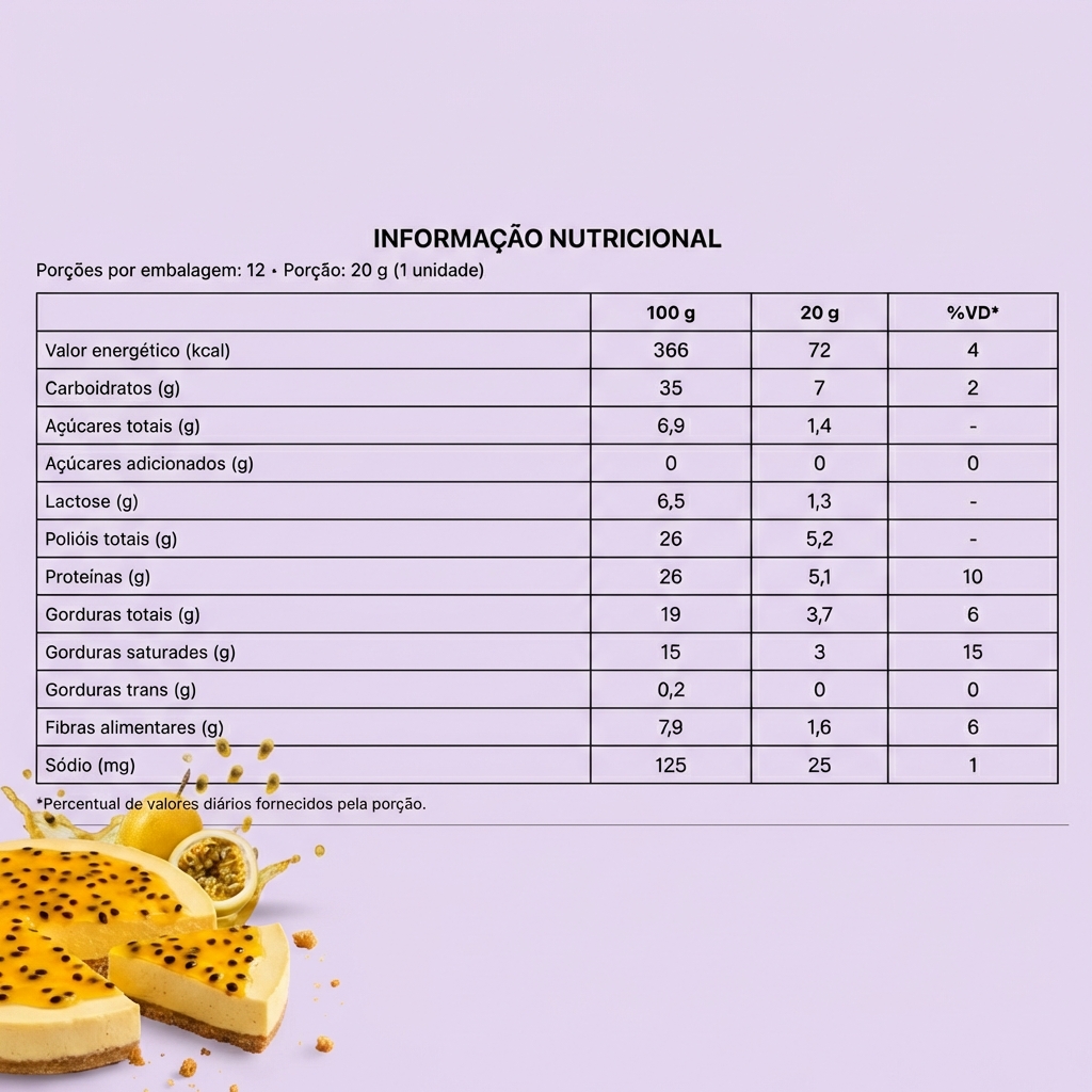 Cobertura branca, recheio sabor mousse de maracujá, concentrado proteico de leite em pó (whey protein), concentrado proteico de soro de leite em pó (whey protein), gordura vegetal de palma, colágeno hidrolisado, edulcorante maltitol, umectante polidextrose, aromatizante, corante curcumina, emulsificante lecitina de soja, acidulante ácido cítrico, conservador sorbato de potássio e antioxidante tocoferol. ALÉRGICOS: CONTÉM DERIVADOS DE LEITE E SOJA. PODE CONTER OVOS, AMENDOIM, AVELÃS, CASTANHA-DE-CAJU, CASTANHA-DO-PARÁ E NOZES. CONTÉM LACTOSE. NÃO CONTÉM GLÚTEN.