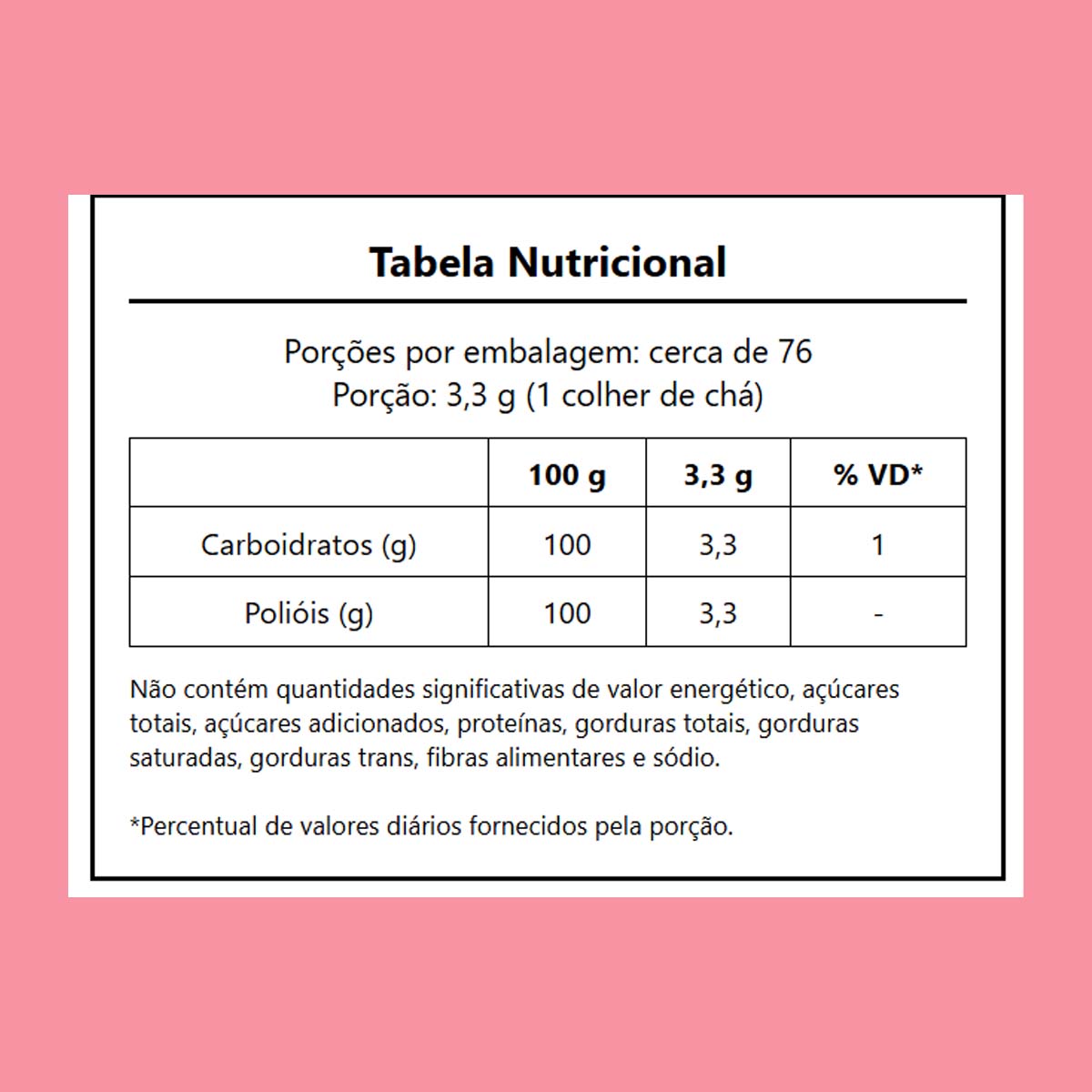 Edulcorante natural eritritol. NÃO CONTÉM GLÚTEN.
