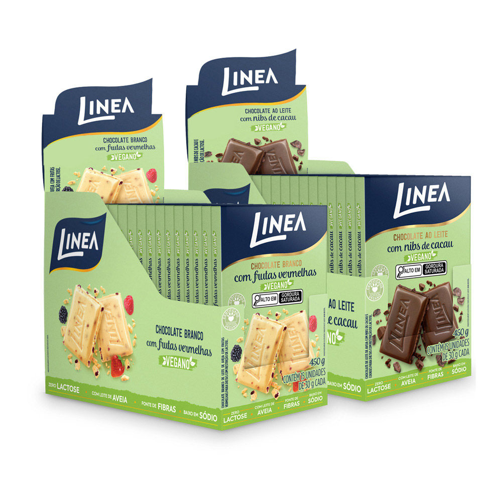 Kit 2 Displays de Chocolate Vegano Linea Sabor Branco com Frutas Vermelhas e Chocolate ao Leite com Nibs de Cacau 15 unidades de 30g