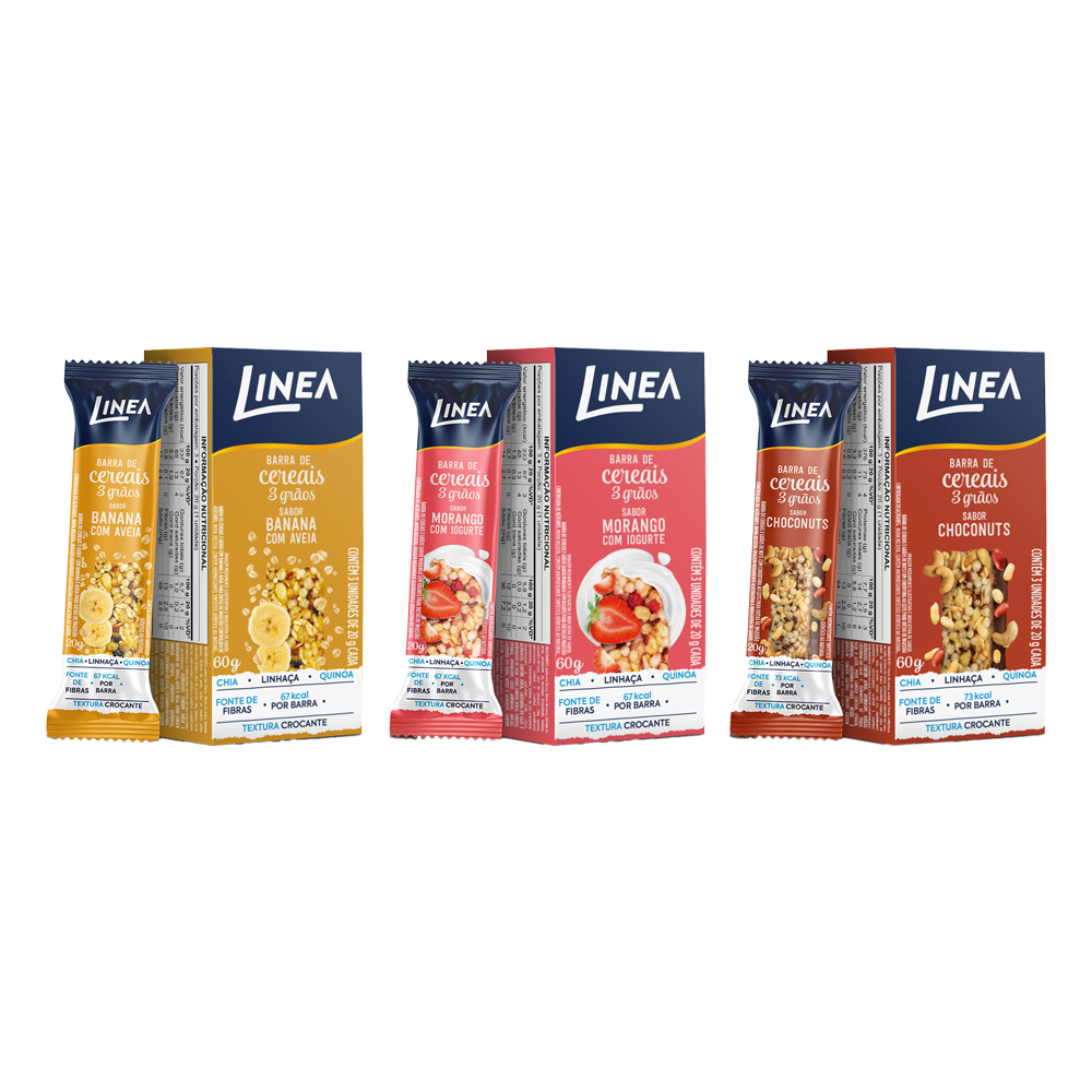 Kit 3 Caixas de Barra de Cereal 3 Grãos Integrais Linea Sabor Choconuts, Banana com Aveia e Morango com Iogurte - 3 und