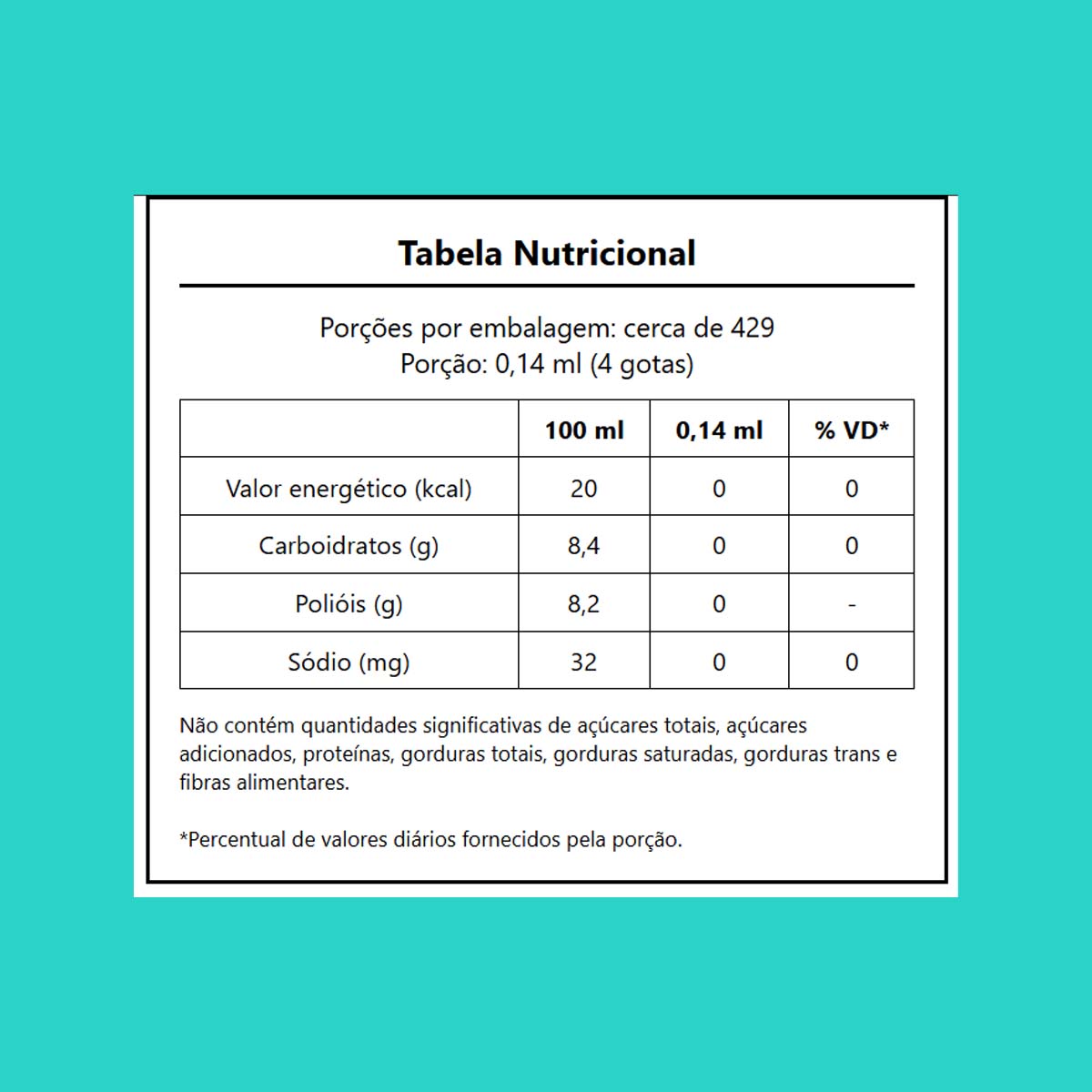 | 100 ml | 0,14 ml | % VD* | Valor Energético (kcal) | 20 | 0 | 0 |