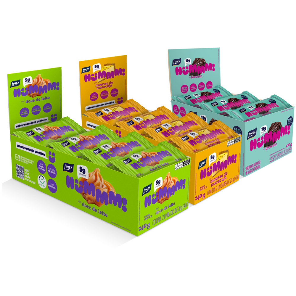 Kit 3 Displays Hummm! Snack Proteico Sabor Brownie, Doce de Leite e Mousse de Maracujá - Caixa com 12 unidades