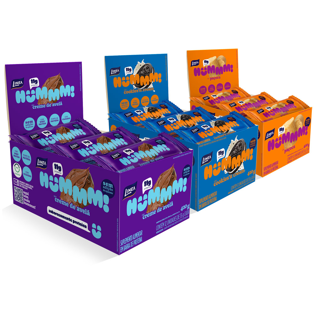 Kit 3 Displays Hummm! Snack Proteico Sabor Cookies’n Cream, Creme de Avelã e Paçoca - Caixa com 12 unidades