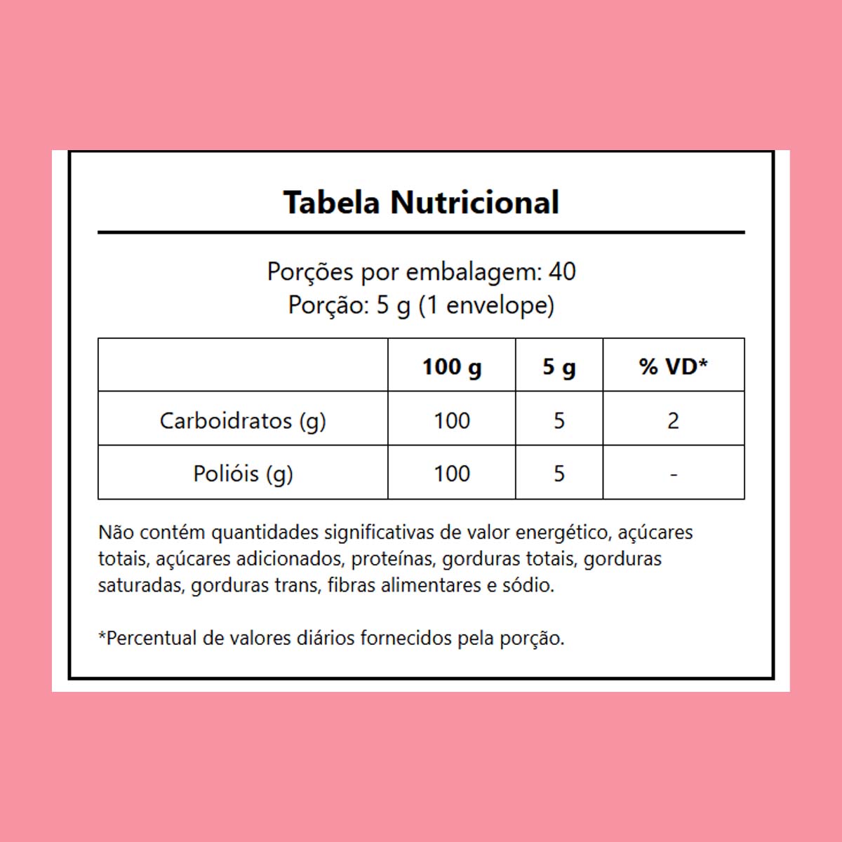 | 100 g | 5 g | % VD* | Carboidratos (g) | 100 | 5 | 2 |