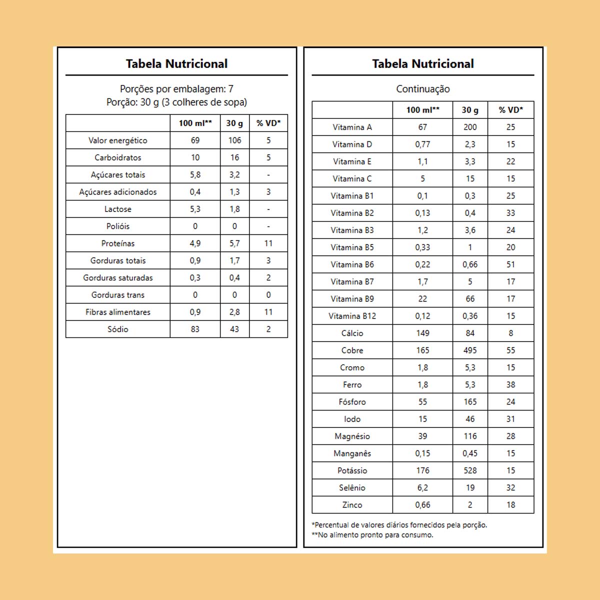 Maltodextrina, farinha de soja integral, leite em pó desnatado, mix de vitaminas e minerais (fosfato de potássio dibásico, citrato tripotássico monohidratado, fosfato de magnésio monohidratado, vitamina C, pirofosfato férrico, niacina, vitamina E, sulfato de zinco monohidratado, ácido pantotênico, vitamina B6, sulfato de manganês monohidratado, vitamina B2, vitamina B1, sulfato cúprico, vitamina A, iodeto de potássio, ácido fólico, selenito de sódio, picolinato de cromo, biotina, vitamina D, vitamina B12), colágeno hidrolisado, composto lácteo (whey protein), óleo de girassol, espessantes: polidextrose e goma xantana, aromatizante, antiumectante dióxido de silício, regulador de acidez fosfato tricálcico, edulcorantes: sucralose e acesulfame de potássio. ALÉRGICOS: CONTÉM DERIVADOS DE SOJA E LEITE. PODE CONTER AMENDOIM. CONTÉM LACTOSE. NÃO CONTÉM GLÚTEN.